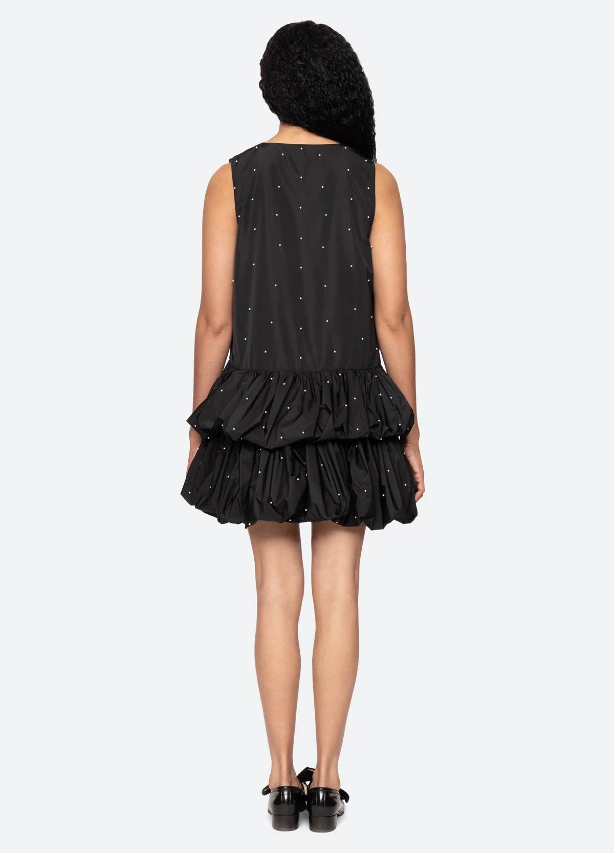 The Alberta pearl tank dress features a v-neckline and a tiered skirt finished with a soft bubble hem. Pearl beading throughout adds a touch of delicate embellishment and charm to its mini silhouette.