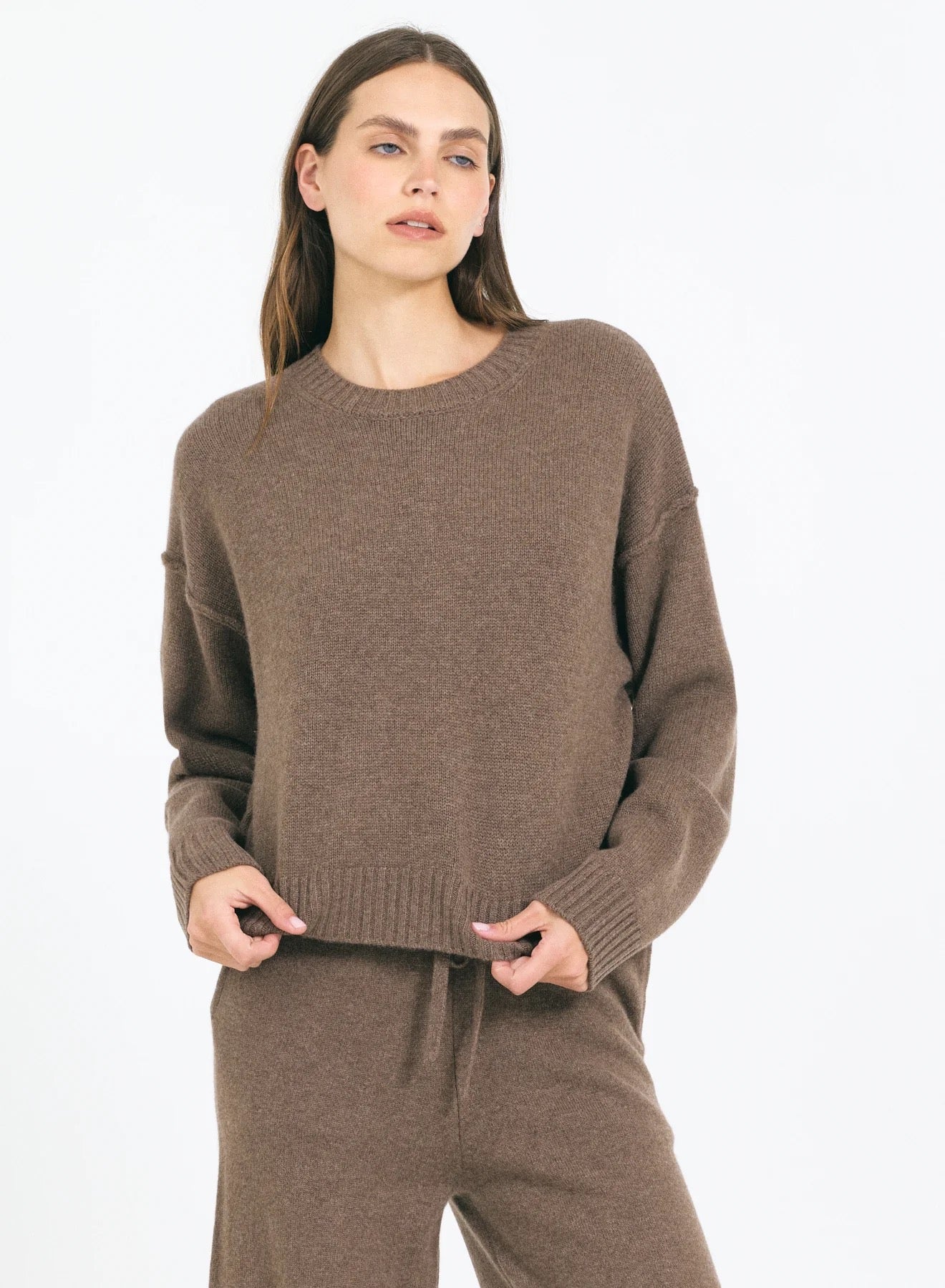 The Annika Crewneck is crafted from 100% cashmere for a soft, elevated feel. Designed with a relaxed fit and clean ribbed trims, it features subtle design details like exposed seams and drop shoulders for an effortlessly modern look.