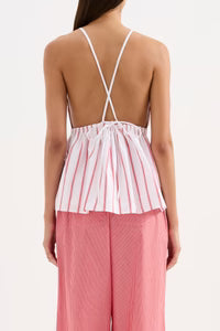 The Anouk Stripe Shirt is made from an organic cotton poplin which has be washed for a smooth, crisp hand feel in a bold white and red stripe. The silhouette is a feminine halter style with a low back. Features include adjustable thin straps that can be styled different ways and elasticated at back waist. The garment is fully lined.