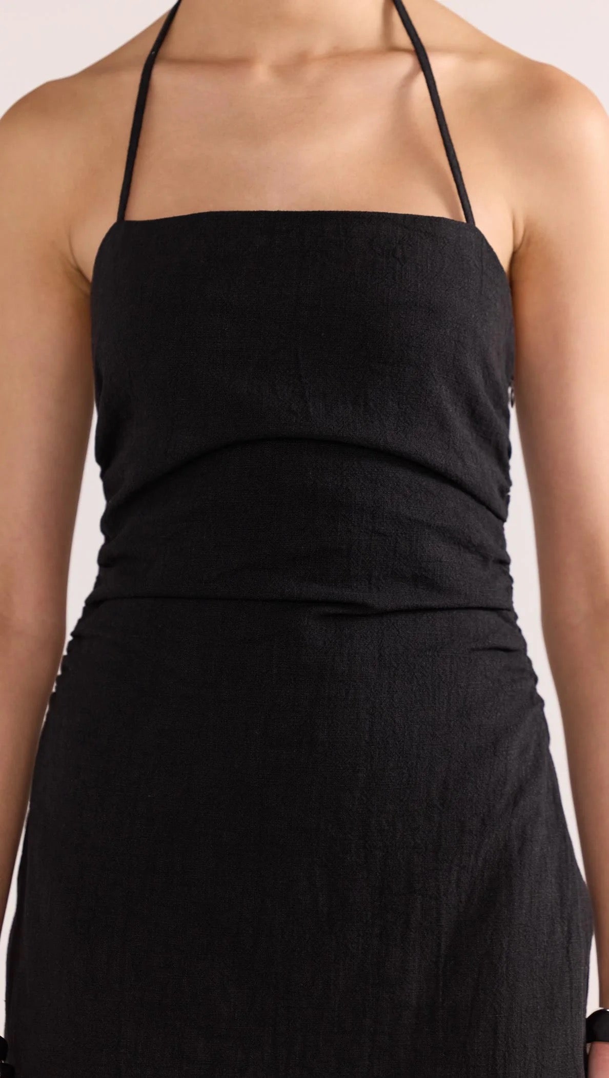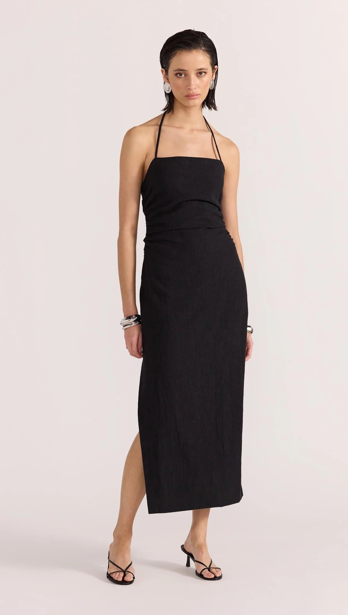 The Athena Halter Midi Dress features a linen blend fabrication, perfect for the warmer seasons. Pair yours with a neutral mule or chunky slide to complete the look.