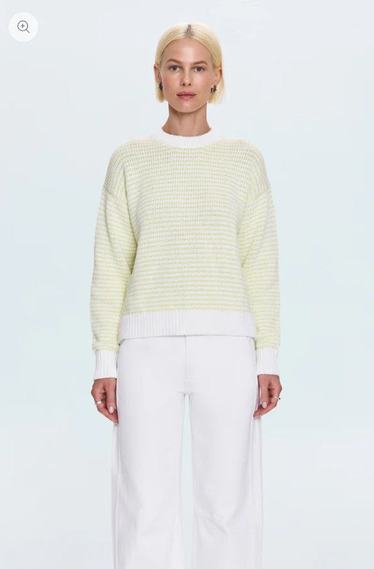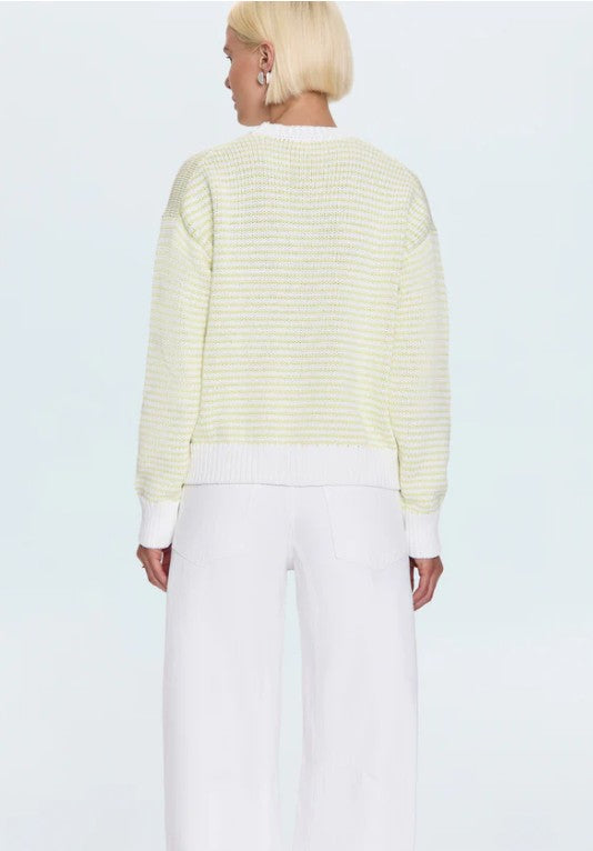 A classic made modern, Aura features a crew neckline and relaxed fit that drapes effortlessly over denim, trousers, or skirts. Knit from 100% cotton, it’s soft yet structured—easy to layer, easy to love. Finished with ribbed details for a touch of texture. Limeade, a refreshing pastel green, adds a playful hit of color that brightens the season.