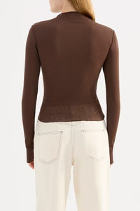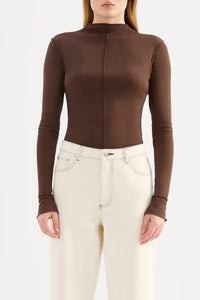 The Emmy Top is made from a stretch jersey with a dry hand feel. The silhouette is a form fitting long sleeve top with length finishing at the hip. Features include a raised neckline, long fitted sleeves, and baby locked neckline, seams and hems.