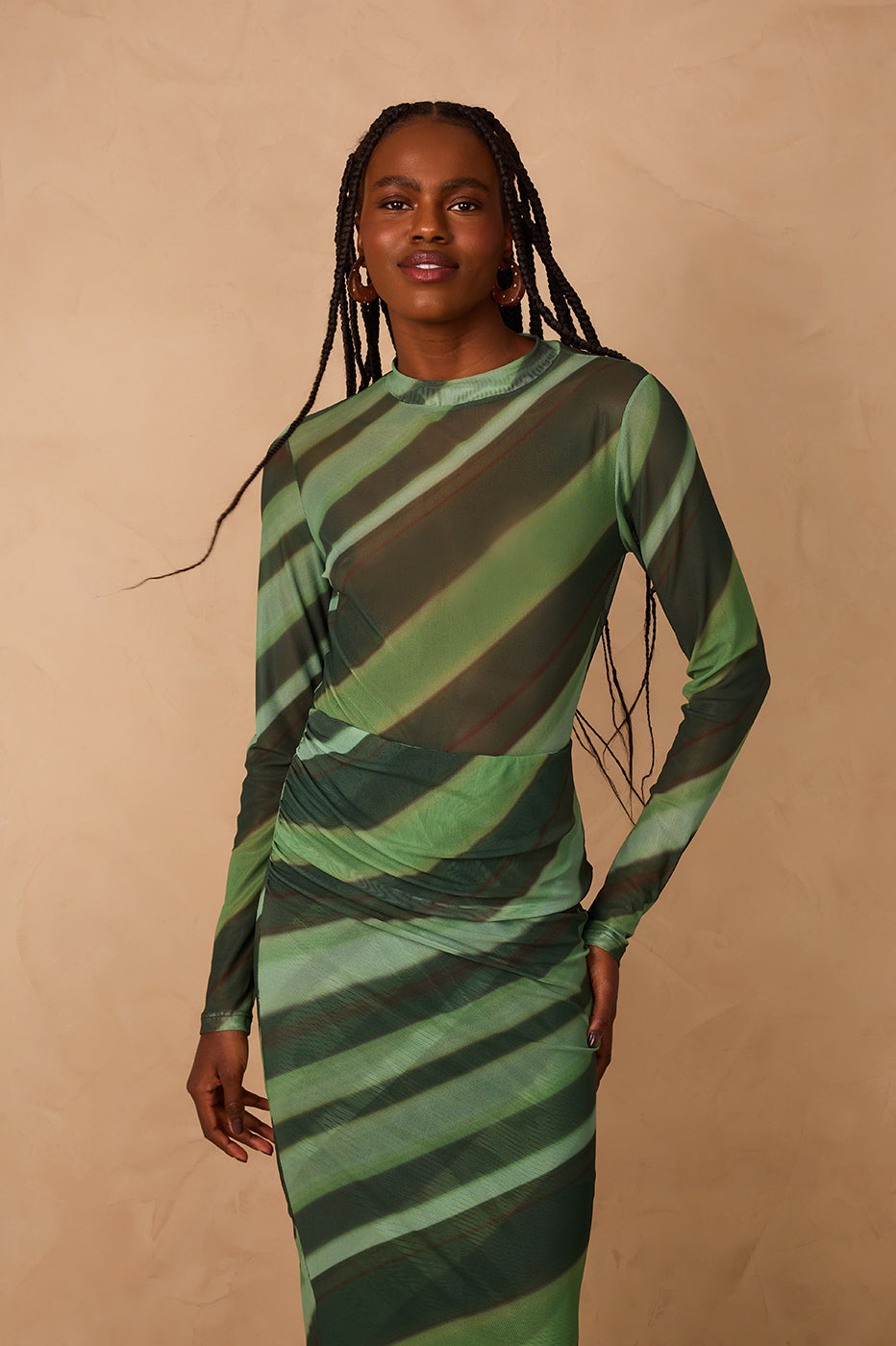 Light mesh bodysuit in a subtle green swirl, perfect to pair with denim.