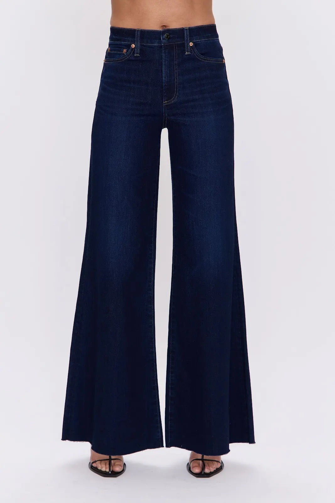 The Izzy mid rise wide leg showcases an slim top block and exaggerated wide leg silhouette with an unexpected kick flare to hem.