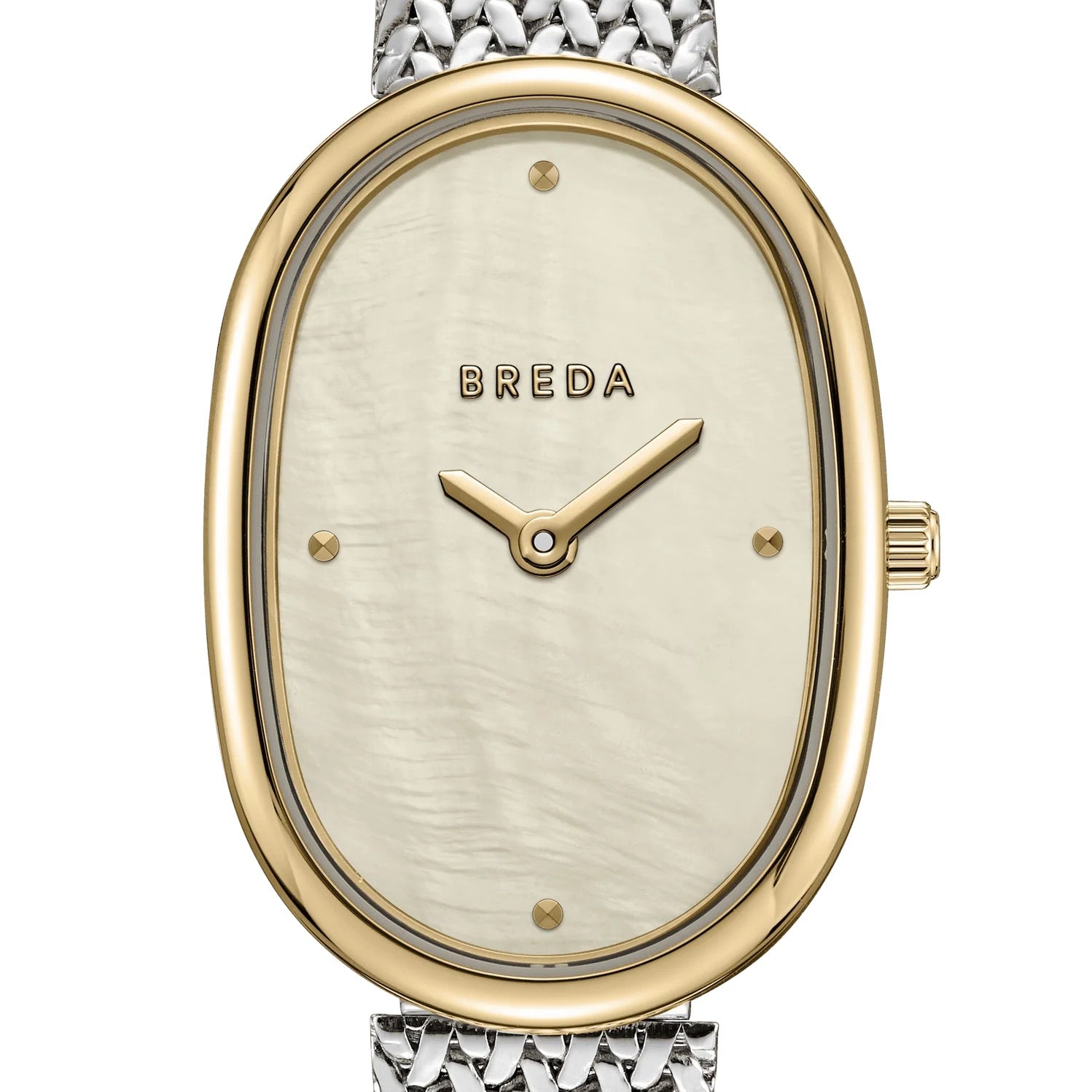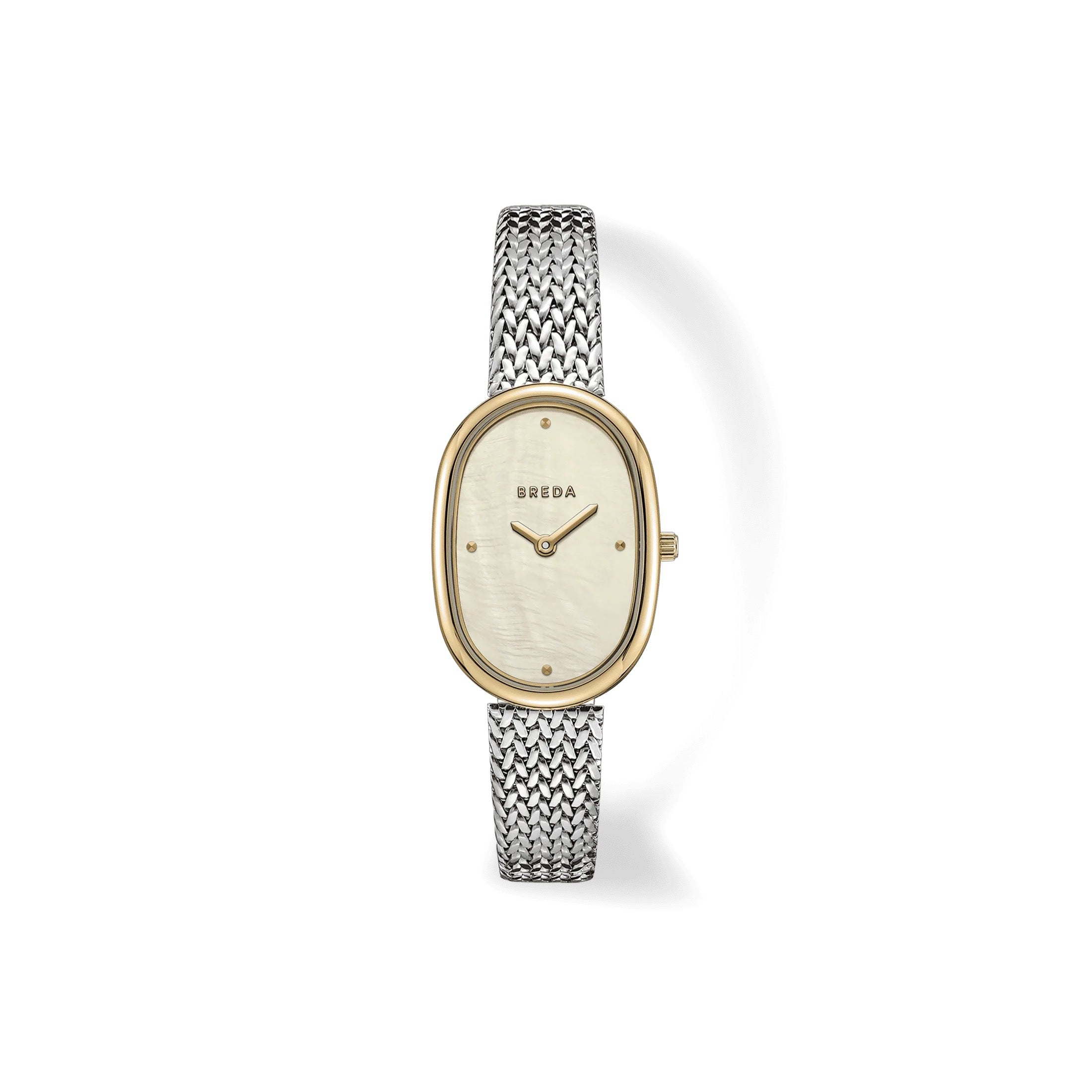 The Tethered collection exists as a daily reminder of our human connection and our shared memories intertwined, endlessly collapsing together. The Jane (Tethered) carries a delicate 23mm oval case, champagne mother of pearl dial and a tapered woven mesh bracelet that fastens with a quick release clasp.