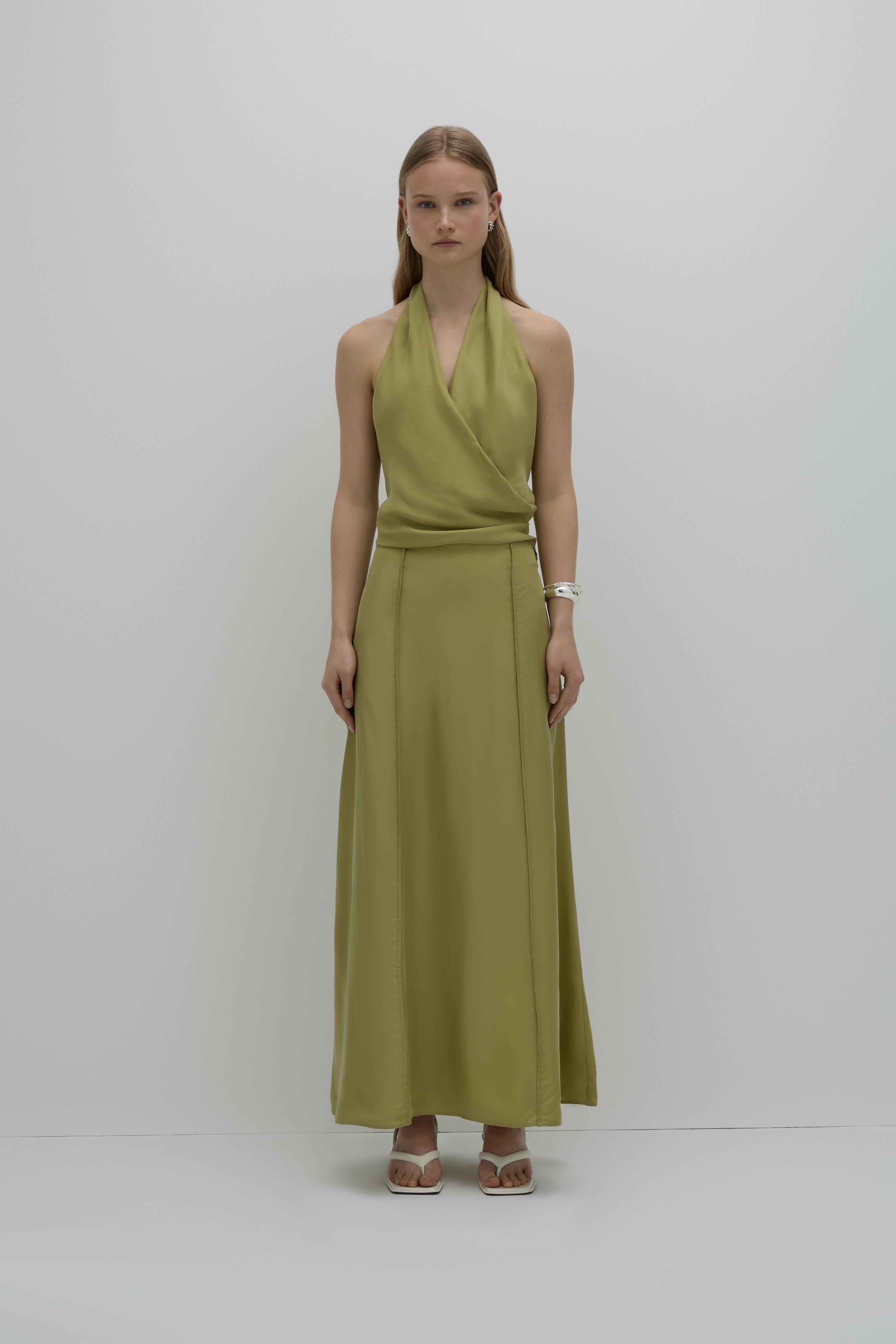 The Leon Cupro Maxi Skirt is made with a premium cupro fabrication with a soft, sueded hand feel. It has a maxi length skirt silhouette, A line shape, pintuck detail through front of skirt and an invisible zipper opening at the back.