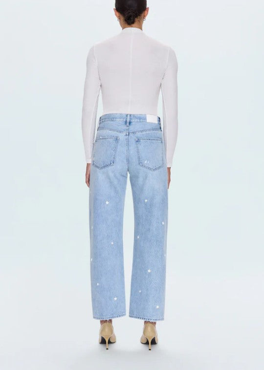 A best-selling silhouette, Lexi sits at a mid-rise with our signature bowed straight leg and a gentle curve through the knee that creates subtle dimension. The cropped 29" inseam tapers cleanly at the ankle, striking the ideal balance of ease and structure. Crafted from rigid denim in Stellar Vintage, a true light blue wash scattered with delicate star embellishments that add a refined, playful touch.