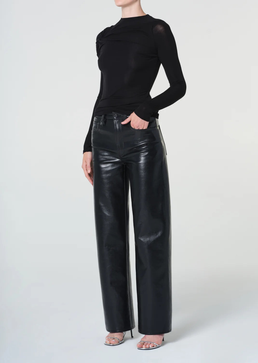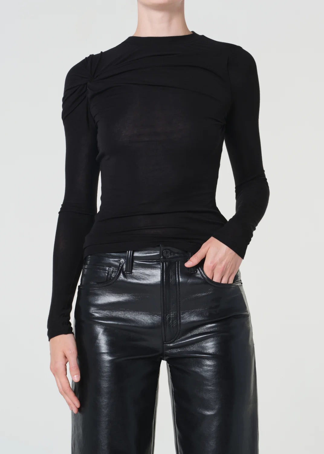 Looks Like: Clean black long sleeve tee with twist detailing at shoulder Feels Like: Ultra-soft, lightweight fine needle baby rib
