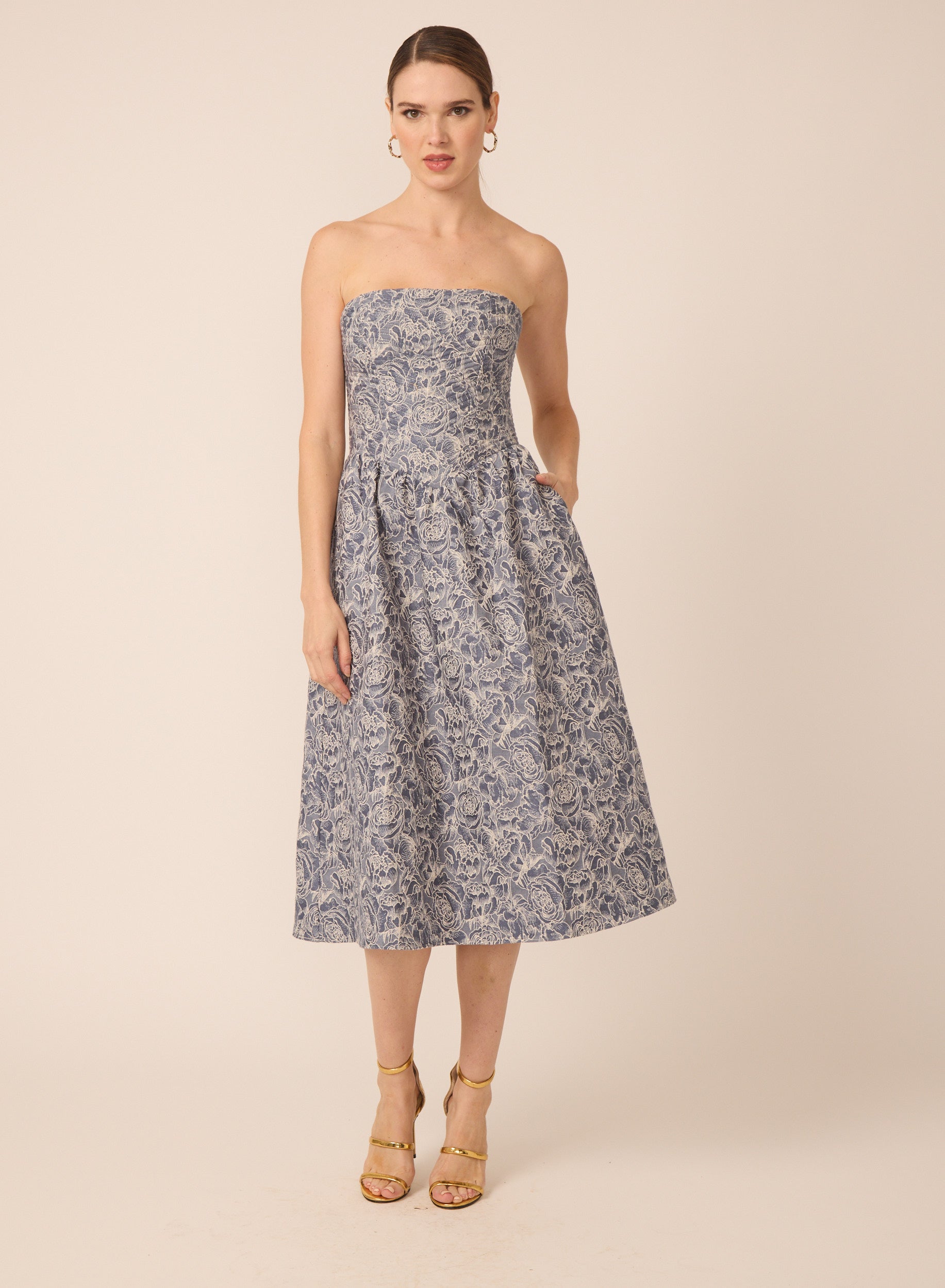 This strapless midi dress features a clean, structured bodice that beautifully defines the waist before falling into a full, softly-pleated skirt. The allover floral pattern adds subtle dimension, while the side pockets keep it effortlessly wearable.