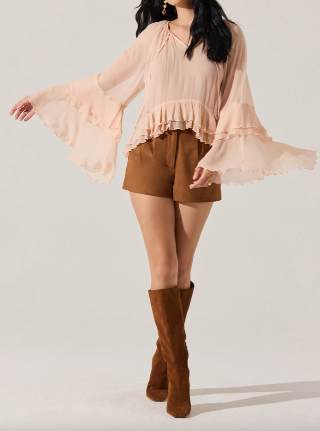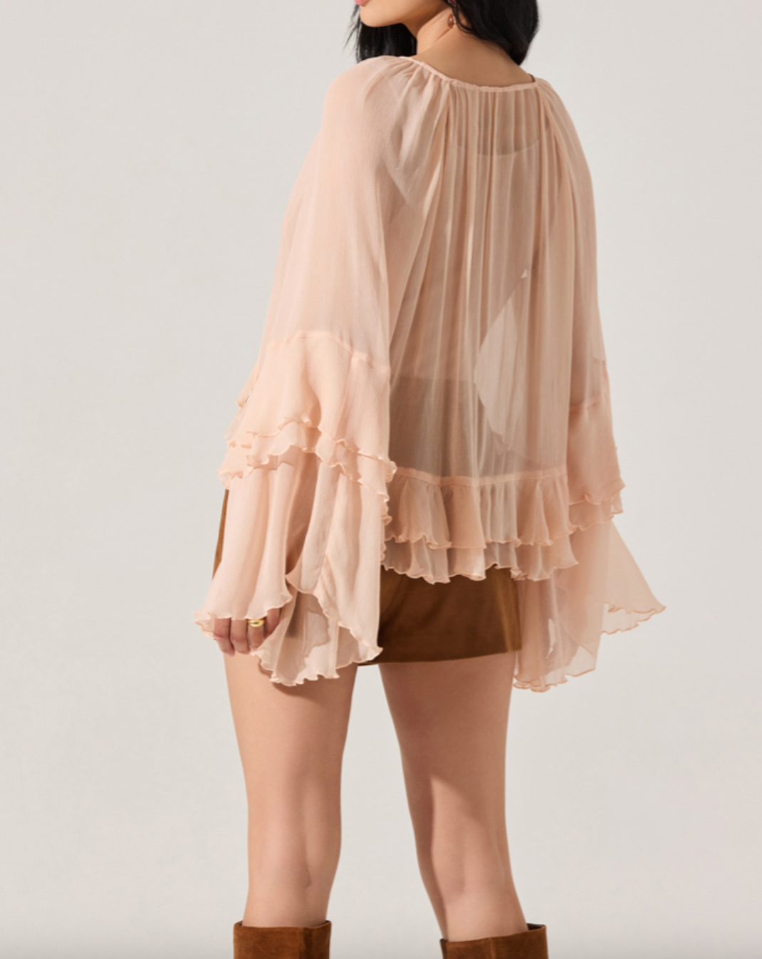 Pink Mesh Margaery Top Long ruffled Sleeves Ruffled bottom See-through Light Pink Tie neck with gold decoration Round neck
