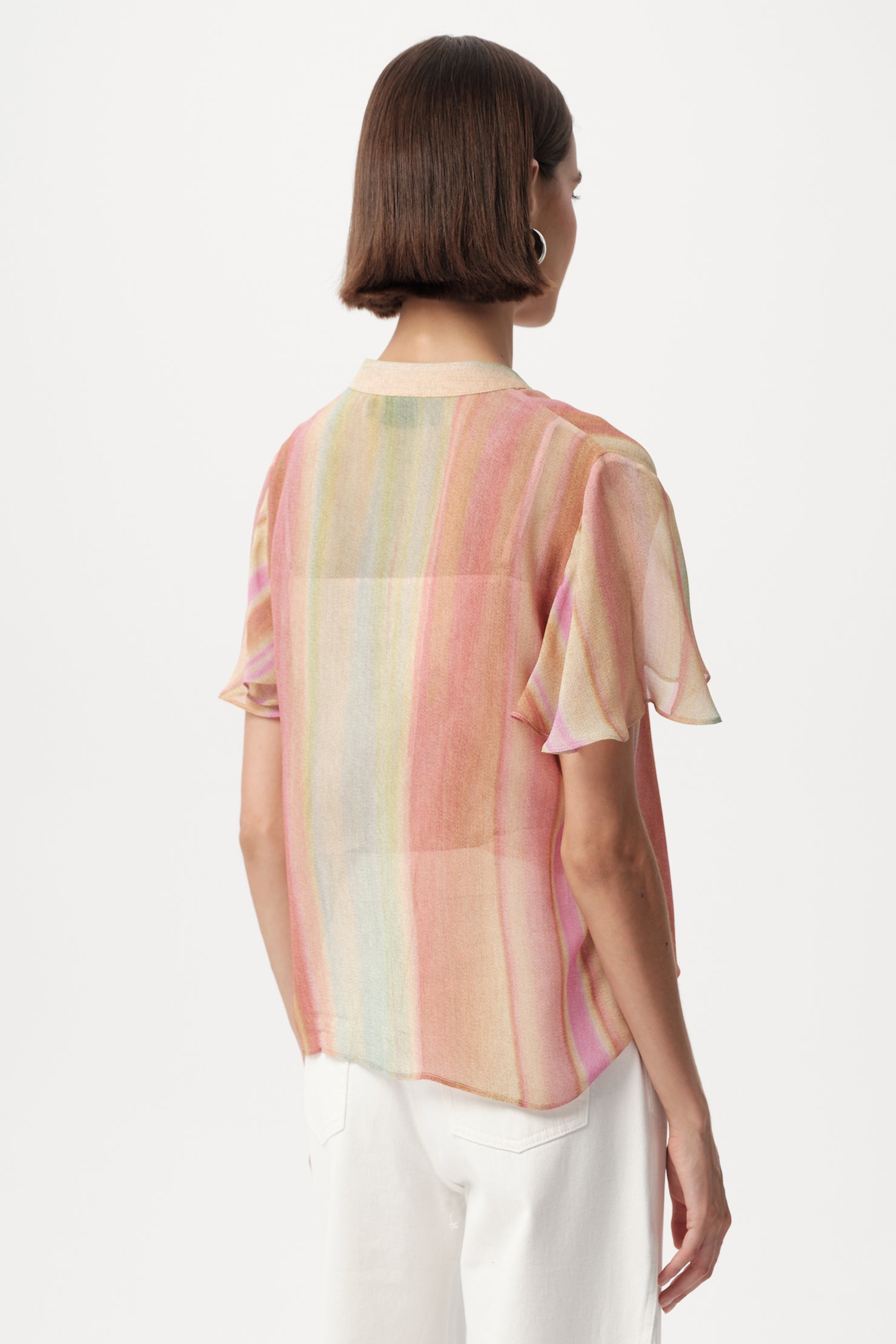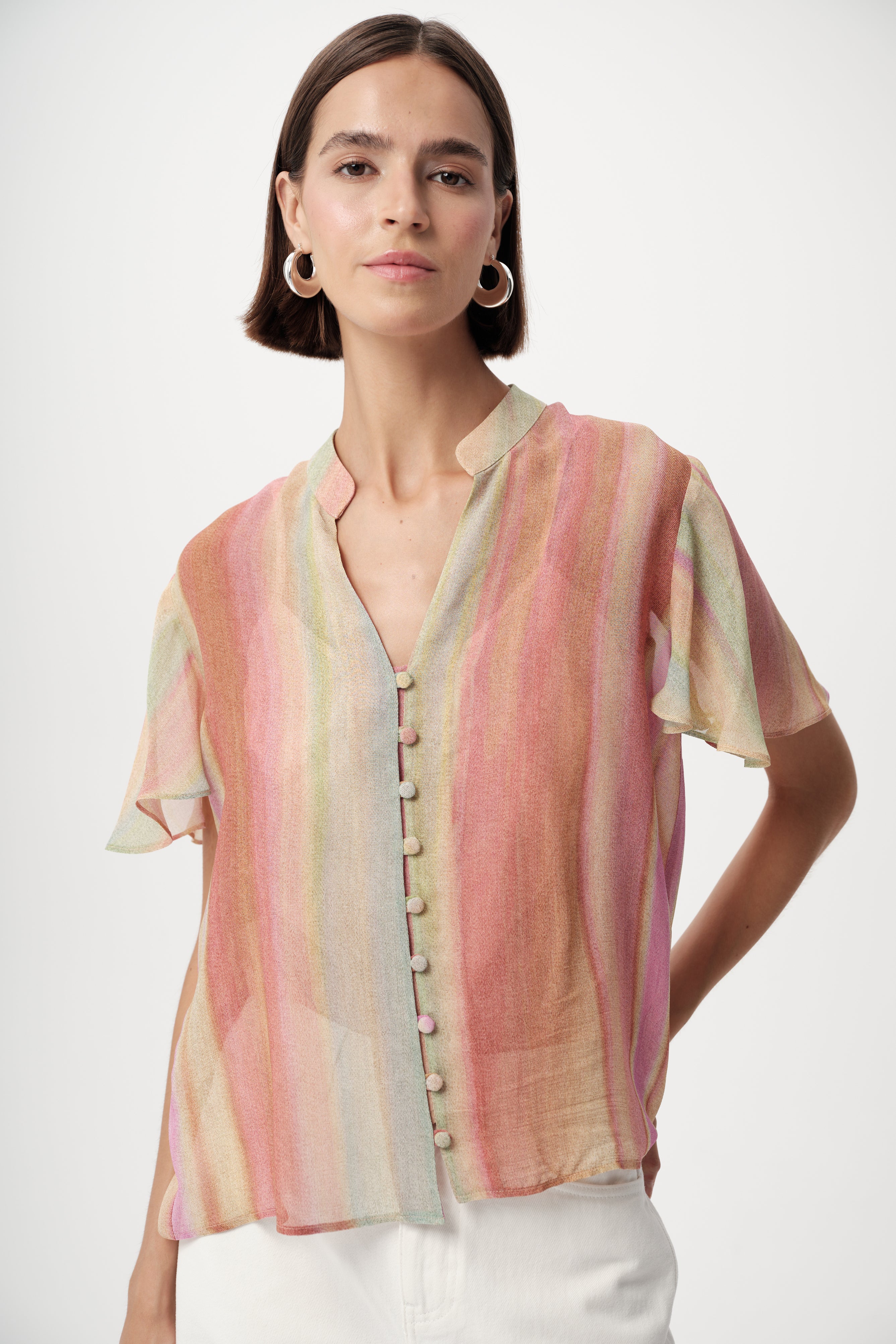 The Nadine blouse offers a comfortable silhouette that is neither too tight nor too loose. The design features a clean neckline and a full-button front, rendered in a muted pink, green, and orange stripe to pair back to the Absolon pant.