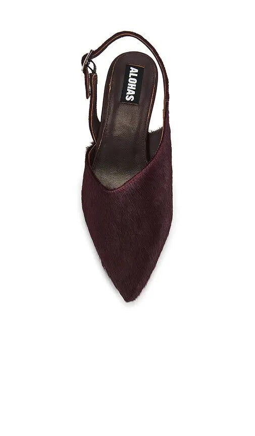 The Nelly Slingback Pump features a leather upper with dyed cow hair and manmade sole. It features a slingback with buckle strap, pointed toe, and kitten heels. It has a leather insole and lining and measures approximately 45mm/ 1.75 inch heel.