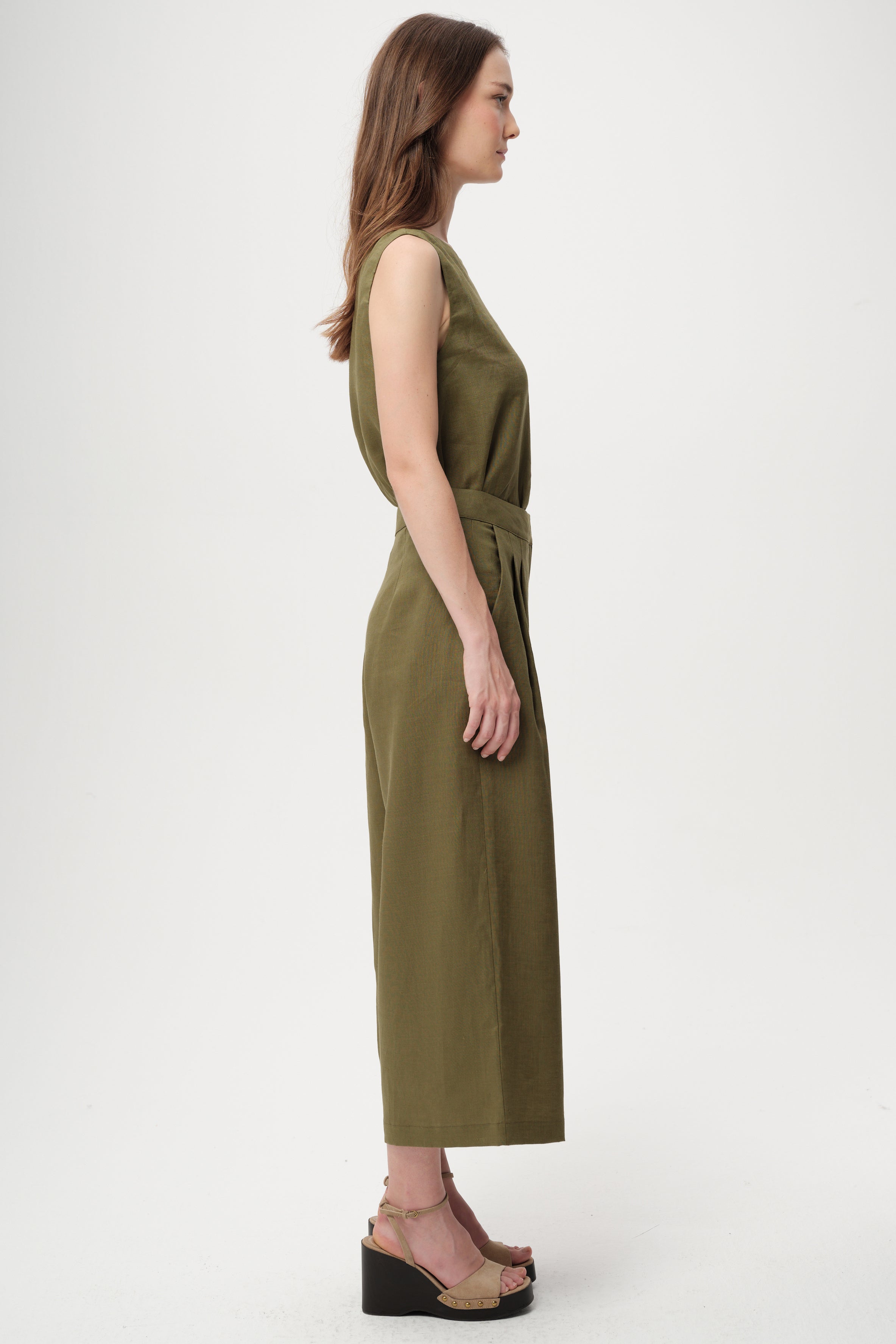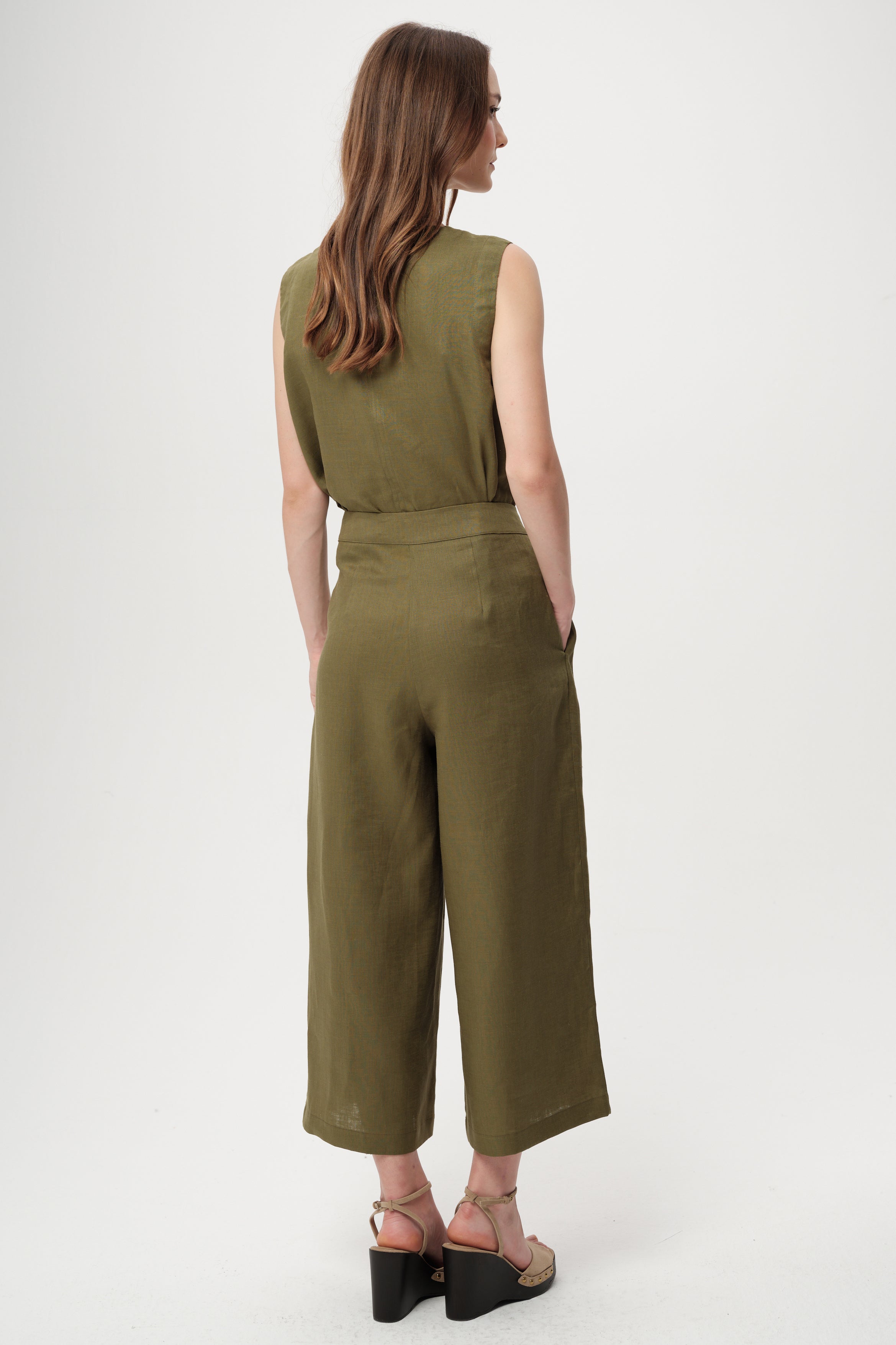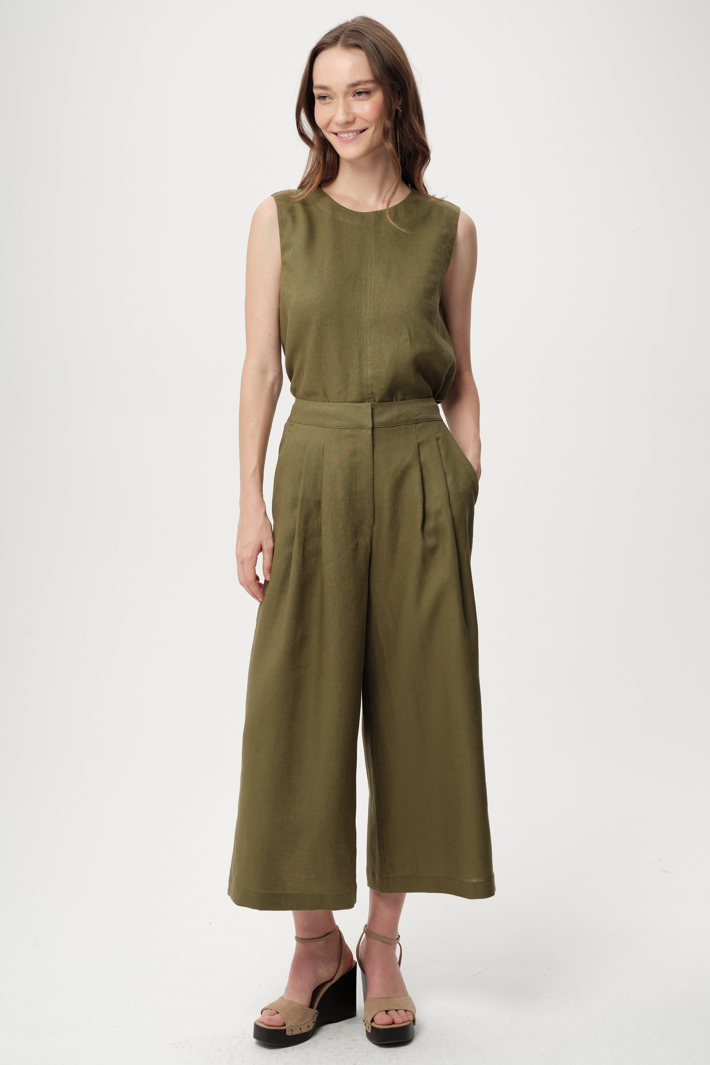 The Owen pants feature a high-waisted fit with a fluid wide-leg cut, cropped above the ankle.