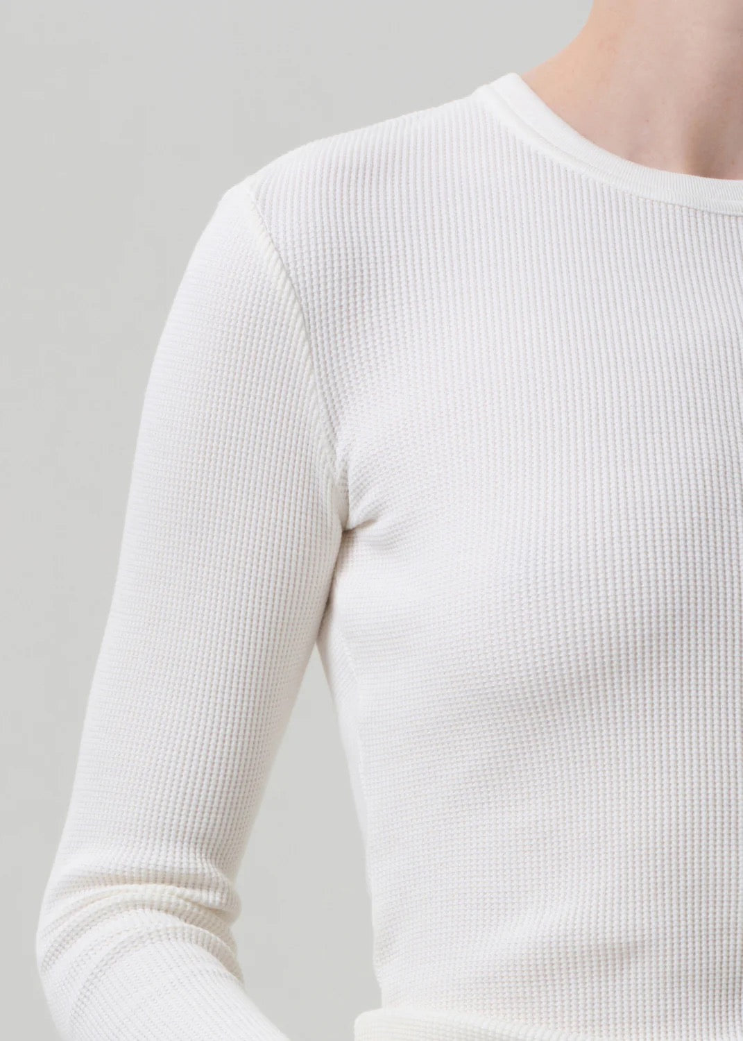 The ‘Pilar’ is a classic long sleeve crewneck updated in soft, regenerative cotton waffle thermal. Midweight with subtle texture, it’s ideal for layering or wearing solo. A go-to for everyday ease—pair with denim, trousers, or sweats.