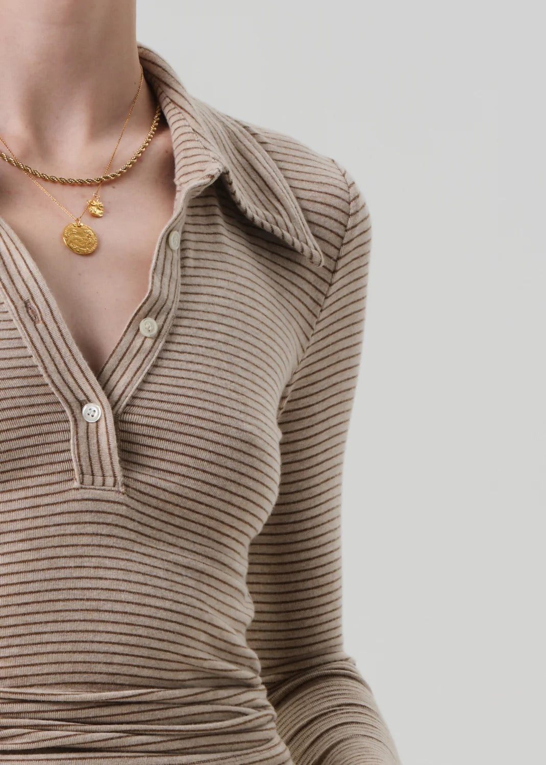 Looks Like: Beige and brown striped long sleeve henley with pointed collar Feels Like: Super soft fine jersey cotton blend that is breathable with the perfect amount of stretch