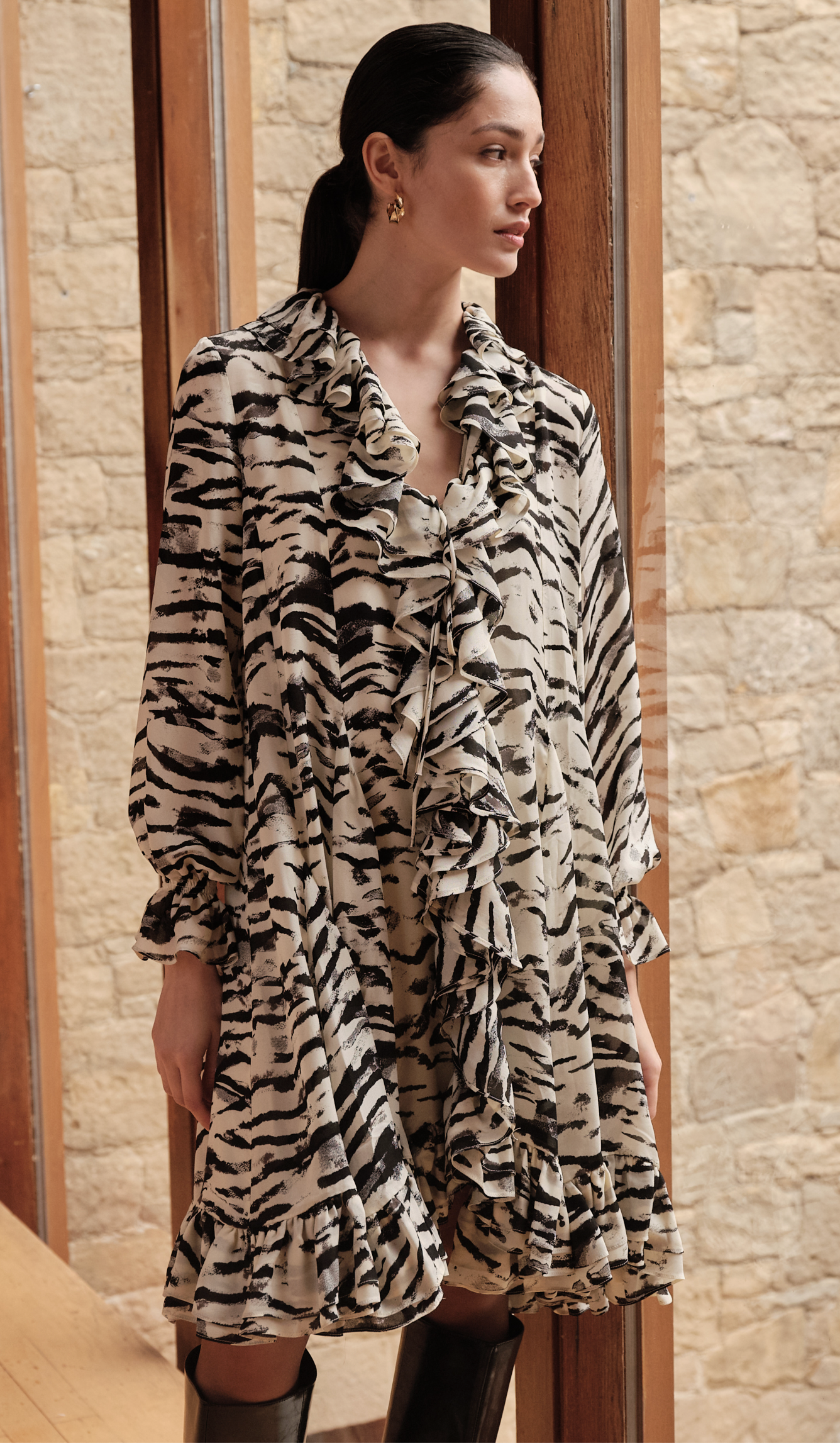 Make a statement in this effortlessly chic zebra-print mini dress. Designed with cascading ruffles and a relaxed silhouette, it strikes the perfect balance between playful and sophisticated. The fluid fabric moves beautifully with every step, while the tie neckline and voluminous sleeves add a touch of romantic flair.