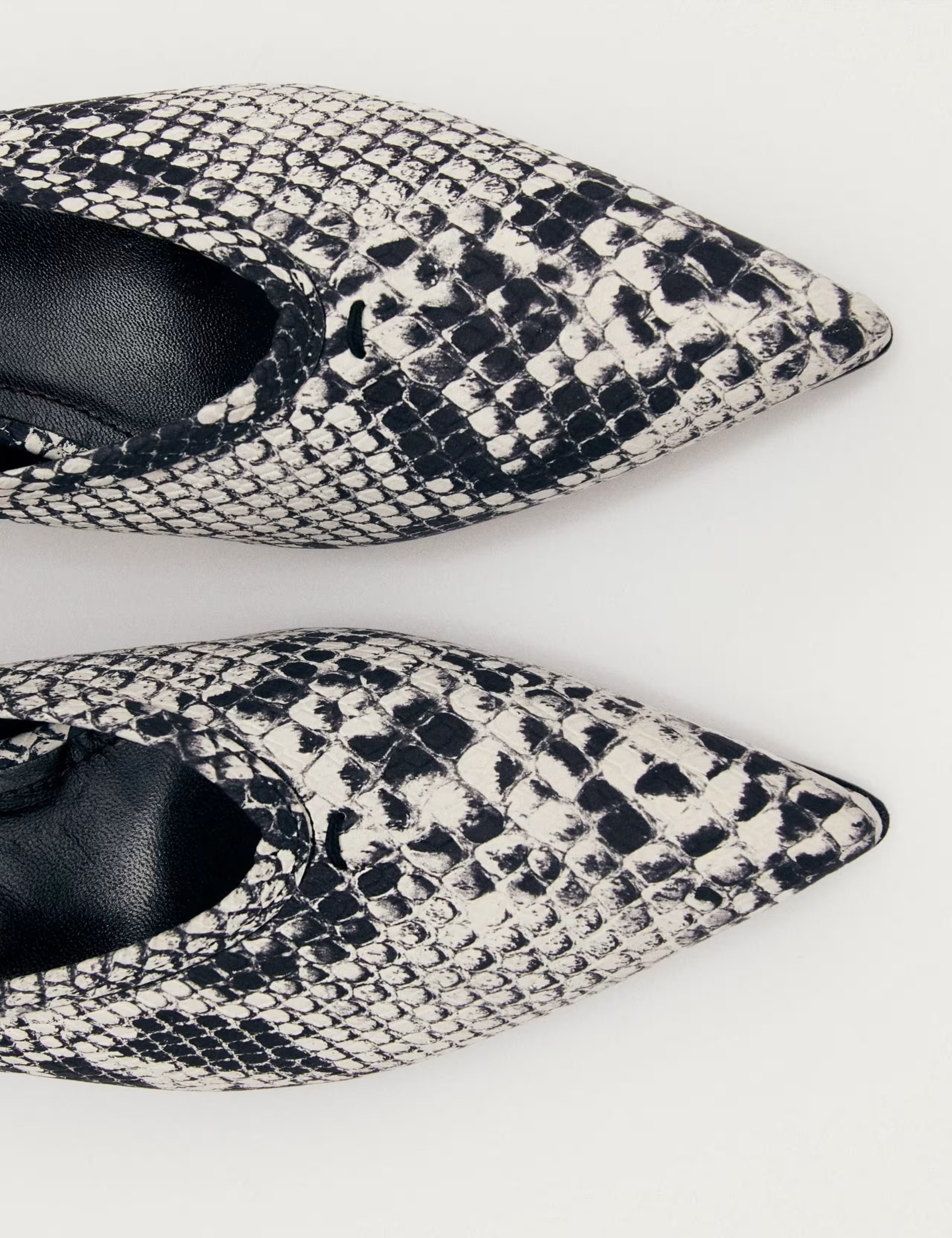 These leather snake print mules from Alohas will add extra zing to your evening looks. They're made in a slip-on style, with elongated pointed toes and slender kitten heels for a contemporary look.