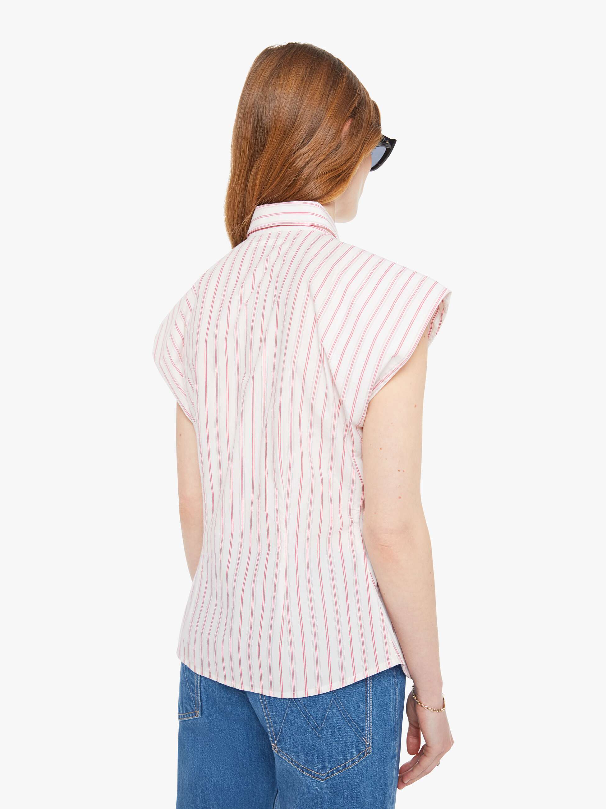 Cross the line. A short-sleeve button-up with an angled bodice and a curved hem. Made from 100% cotton, Line Breaker is a white and light pink stripe pattern.