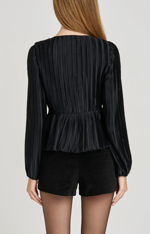 With its deep V neckline, long sleeves, and delicate pleating, this statement top is effortlessly refined. A velvet bow accentuates the waist, adding a touch of feminine charm to its modern peplum silhouette.