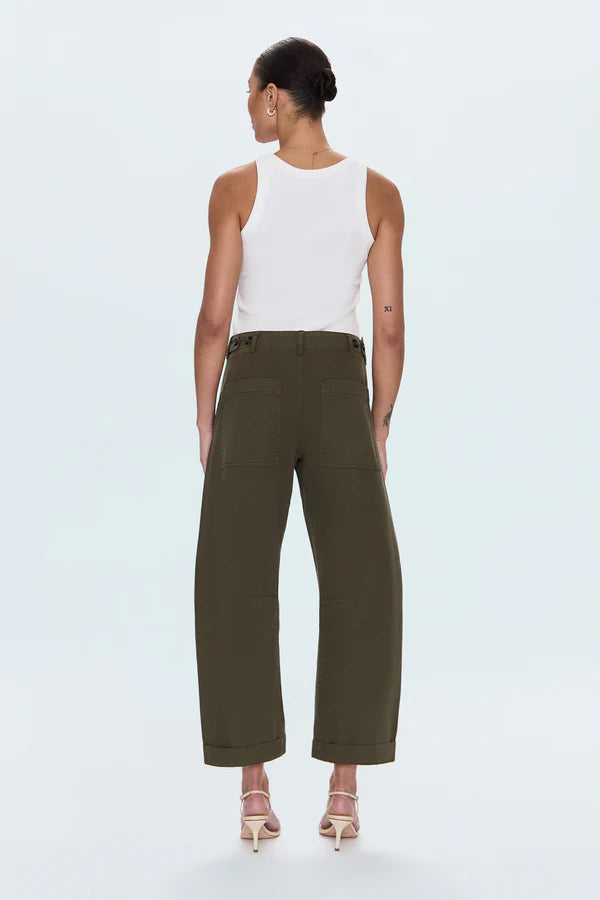 A utilitarian-inspired silhouette, Tori features our signature bowed leg, functional details, and a cropped 26 ½" inseam that hits at the ankle. Crafted from 100% cotton for structure and comfort, Sequoia brings understated sophistication in a deep olive tone that transitions effortlessly from day to night.